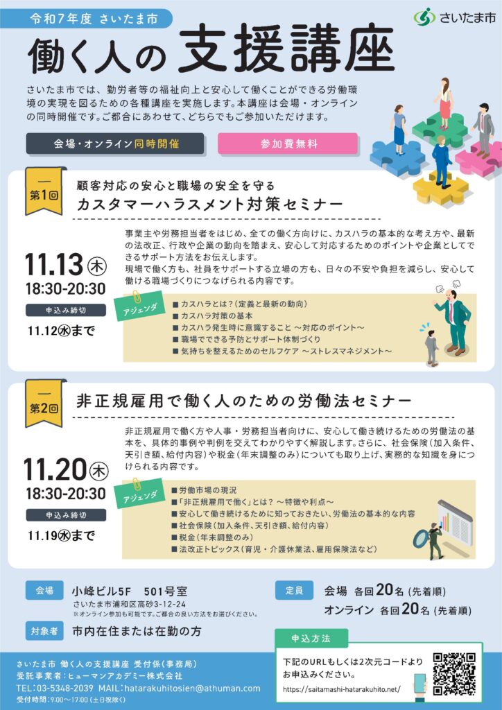 さいたま市では、勤労者等の福祉向上と安心して働くことができる労働環境の実現を図るための各種講座を実施します。本講座は会場・オンラインの同時開催です。ご都合にあわせて、どちらでもご参加いただけます。